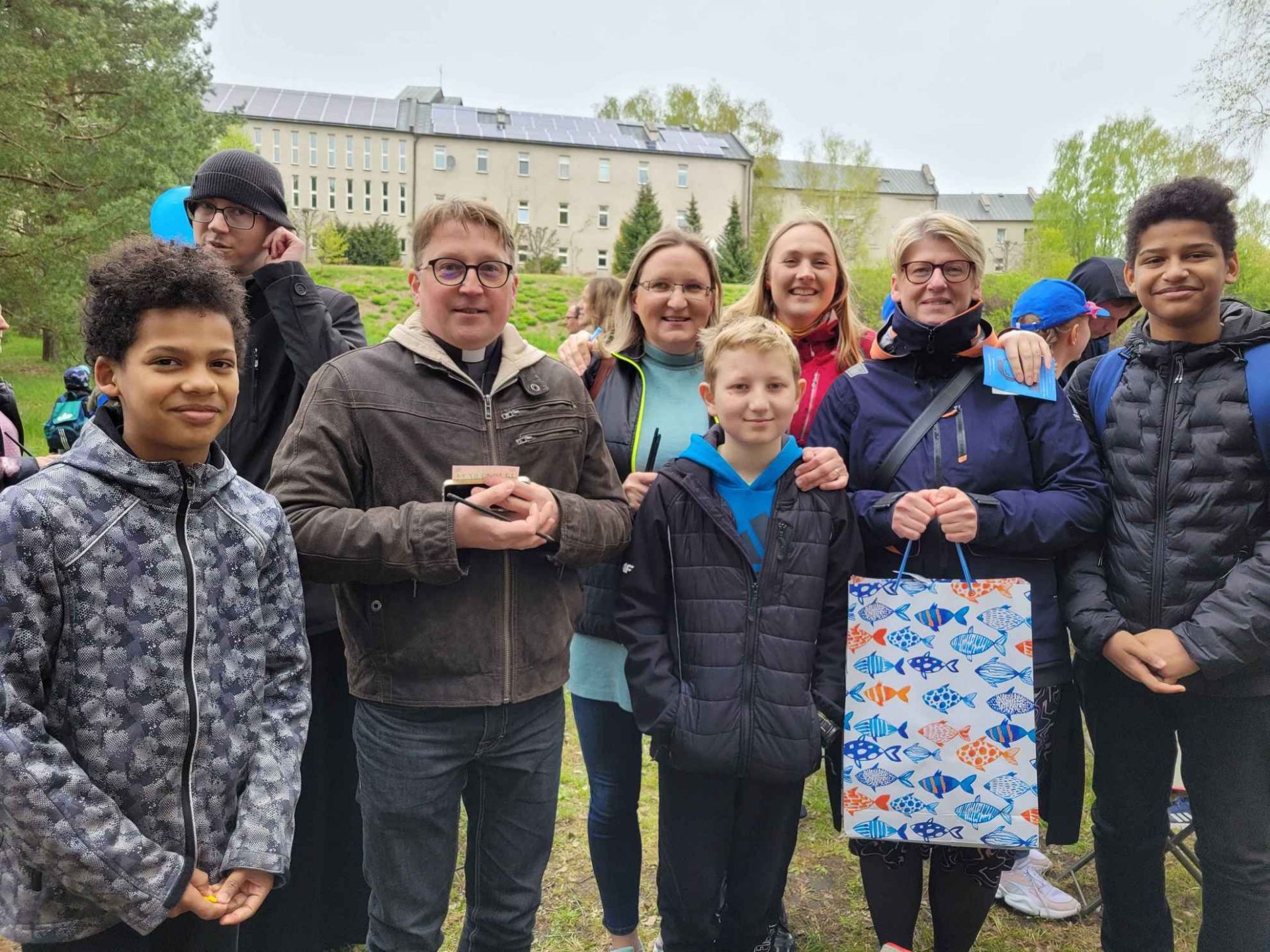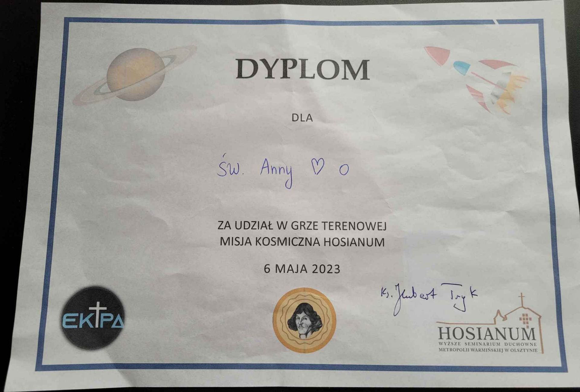 Dnia 6 maja 2023 niewielka grupa naszych parafian wzięła udział w grze terenowej, która była jedną z atrakcji Dnia Wdzięczności w Seminarium Duchownym Hosianum. Przy wsparciu naszego proboszcza ks. Tomasza udało nam się dotrzeć do ostatniego zadania gry. Niestety nie zajęliśmy miejsca na podium, ale i tak warto było uczestniczyć w tej „misji kosmicznej” przygotowanej przez kleryków. Dyplom wręczył nam sam Rektor ks. Hubert Tryk. Udało nam się natomiast wygrać grę w Bingo. Były kiełbaski seminaryjne z grilla, wata cukrowa, popcorn oraz kawa i sernik w towarzystwie naszego byłego proboszcza ks. Huberta w rektoracie. Minęło już prawie 6 lat odkąd ks. Hubert przestał być proboszczem naszej parafii, ale więź nadal jest silna.