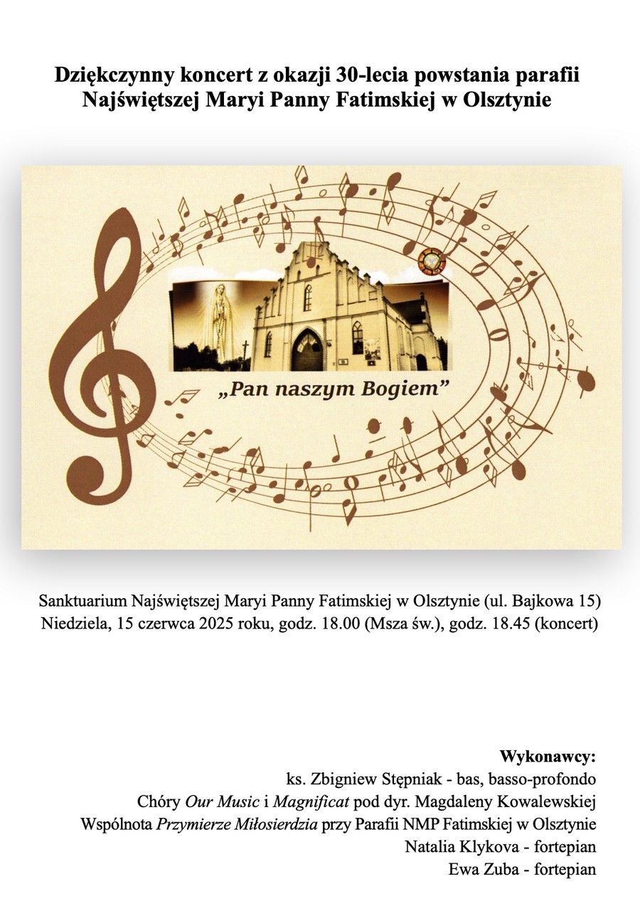 Sanktuarium Najświętszej Maryi Panny Fatimskiej w Olsztynie (ul. Bajkowa 15) zaprasza na Dziękczynny koncert z okazji 30-lecia powstania Parafii który odbędzie w Niedzielę 15 czerwca 2025 r. godz. 18.00 Msza Święta, godz. 18.45 Koncert