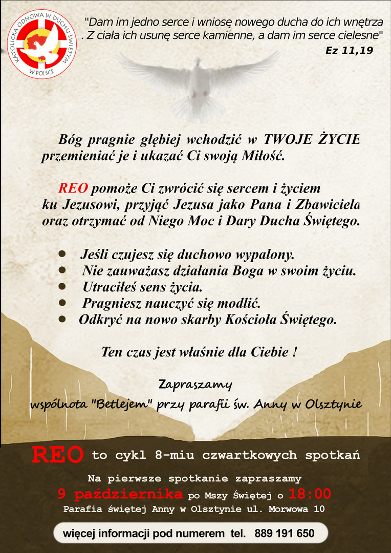 Wspólnota Odnowy w Duchu Świętym "Betlejem" przy Parafii św. Anny zaprasza do udziału w Rekolekcjach Ewangelizacyjnych Odnowy (REO) . REO to skrót od Rekolekcji Ewangelizacyjnych Odnowy w Duchu Świętym, czyli inicjatywy formacyjnej w ramach katolickiej odnowy charyzmatycznej. Mają one na celu pogłębienie wiary, odnowienie relacji z Bogiem oraz doświadczenie odrodzenia w Duchu Świętym. Rekolekcje te są formą ewangelizacji, prowadzoną przez wspólnoty katolickie, i trwają 8 tygodni, wymagając od uczestników zaangażowania w codzienne modlitwy i cotygodniowe spotkania w grupach