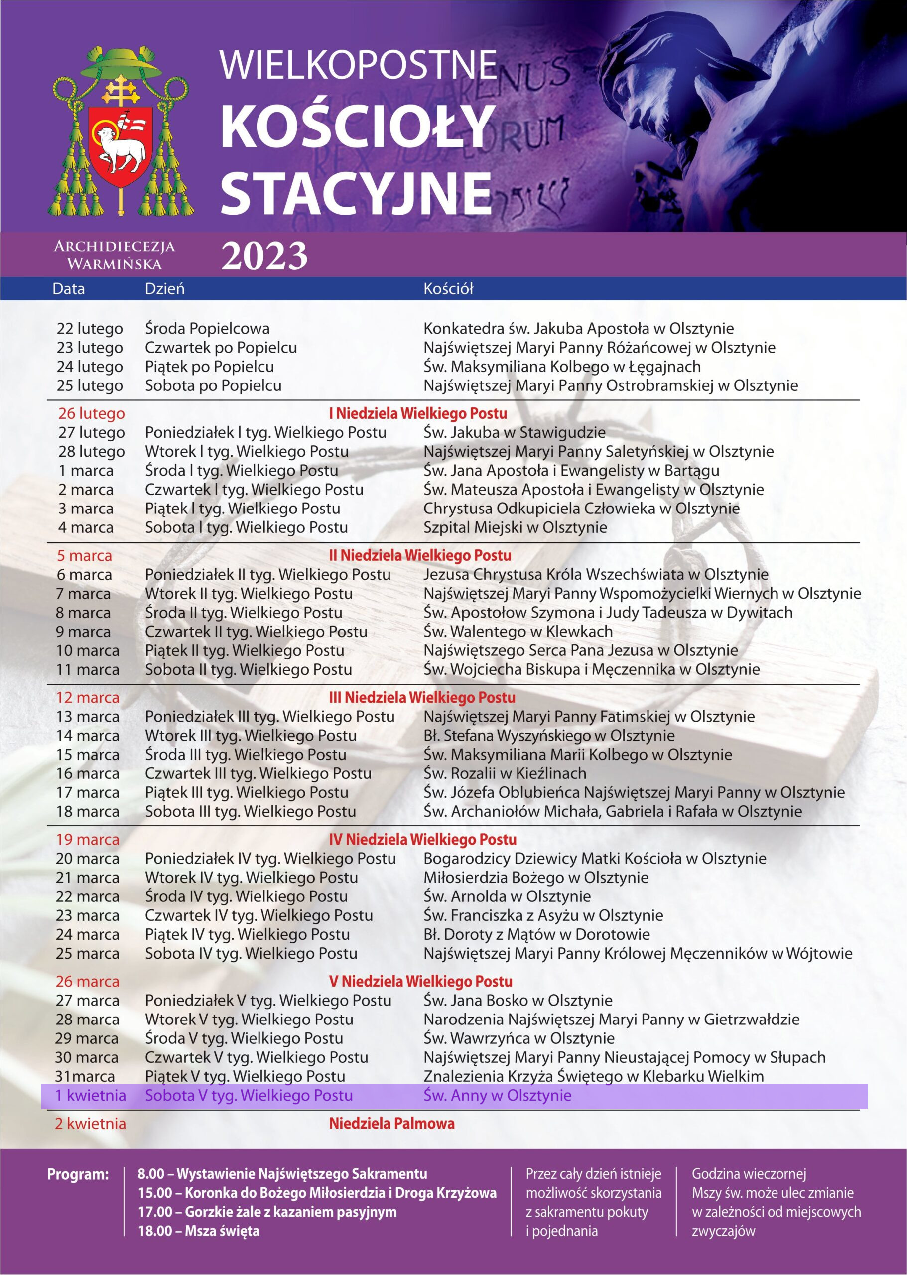 Tradycyjnie w okresie Wielkiego Postu w archidiecezji warmińskiej odbywać się będą wielkopostne liturgie stacyjne. Jest to nawiązanie do starożytnej tradycji rzymskiej, która polega na podjęciu 40-dniowej praktyki nawiedzania poszczególnych, wyznaczonych do tego celu kościołów, w których trwać będzie całodzienna modlitwa, prowadzona według specjalnego, wspólnego dla wszystkich schematu. Tradycja rzymska kościołów stacyjnych zrodziła się na przełomie IV i V wieku i trwała do okresu tzw. niewoli awiniońskiej (XIV. wiek). Została wznowiona w wieku XX.