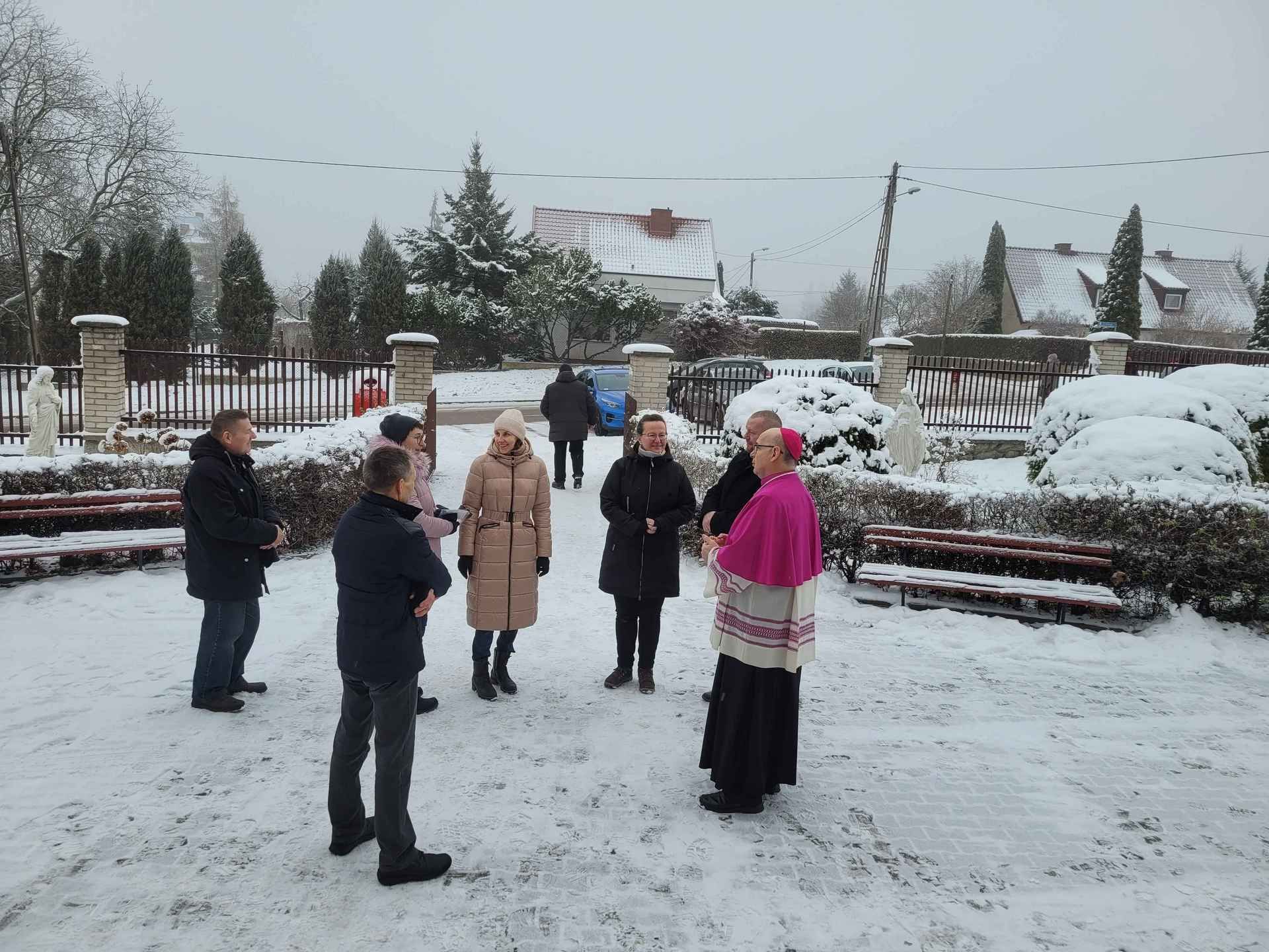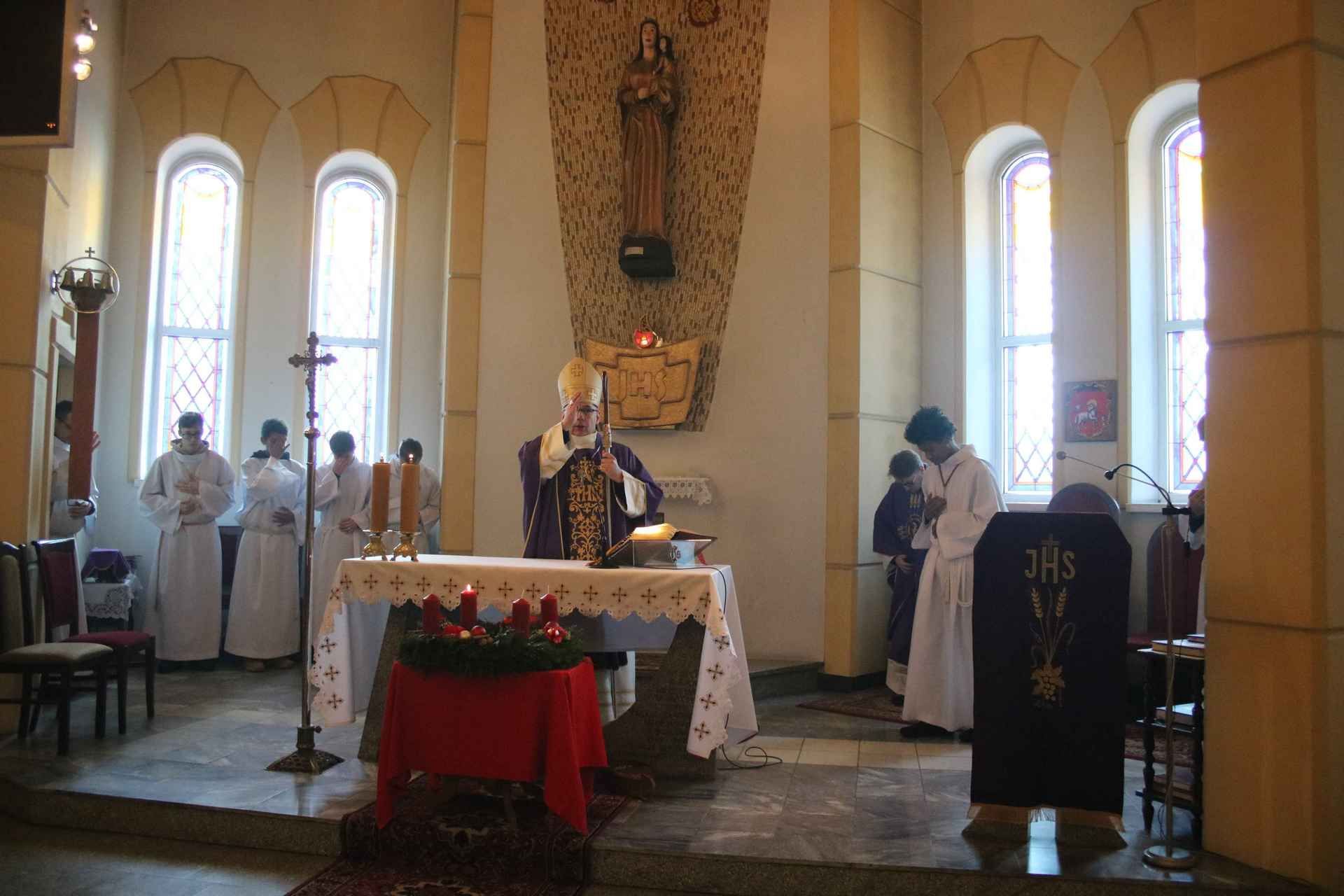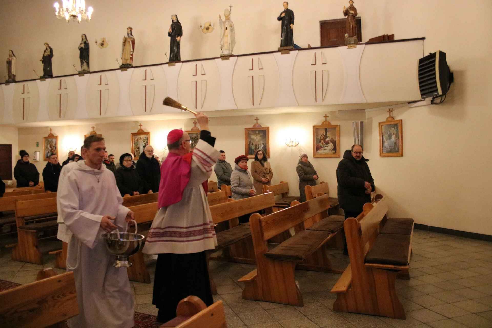 Wizyta ks. Biskupa rozpoczęła się tuż przed godziną ósmą ucałowaniem przez niego krzyża w przedsionku kościoła. Następnie Jego Ekscelencja pokropił wodą święconą wiernych zebranych na porannej mszy świętej. Potem nastąpiła krótka modlitwa, a zaraz po niej oficjalne powitanie dostojnego Gościa przez parafian. Mszę świętą o godz. 8:00 odprawił ks. Mariusz Rybicki – kapelan Biskupa Janusza.