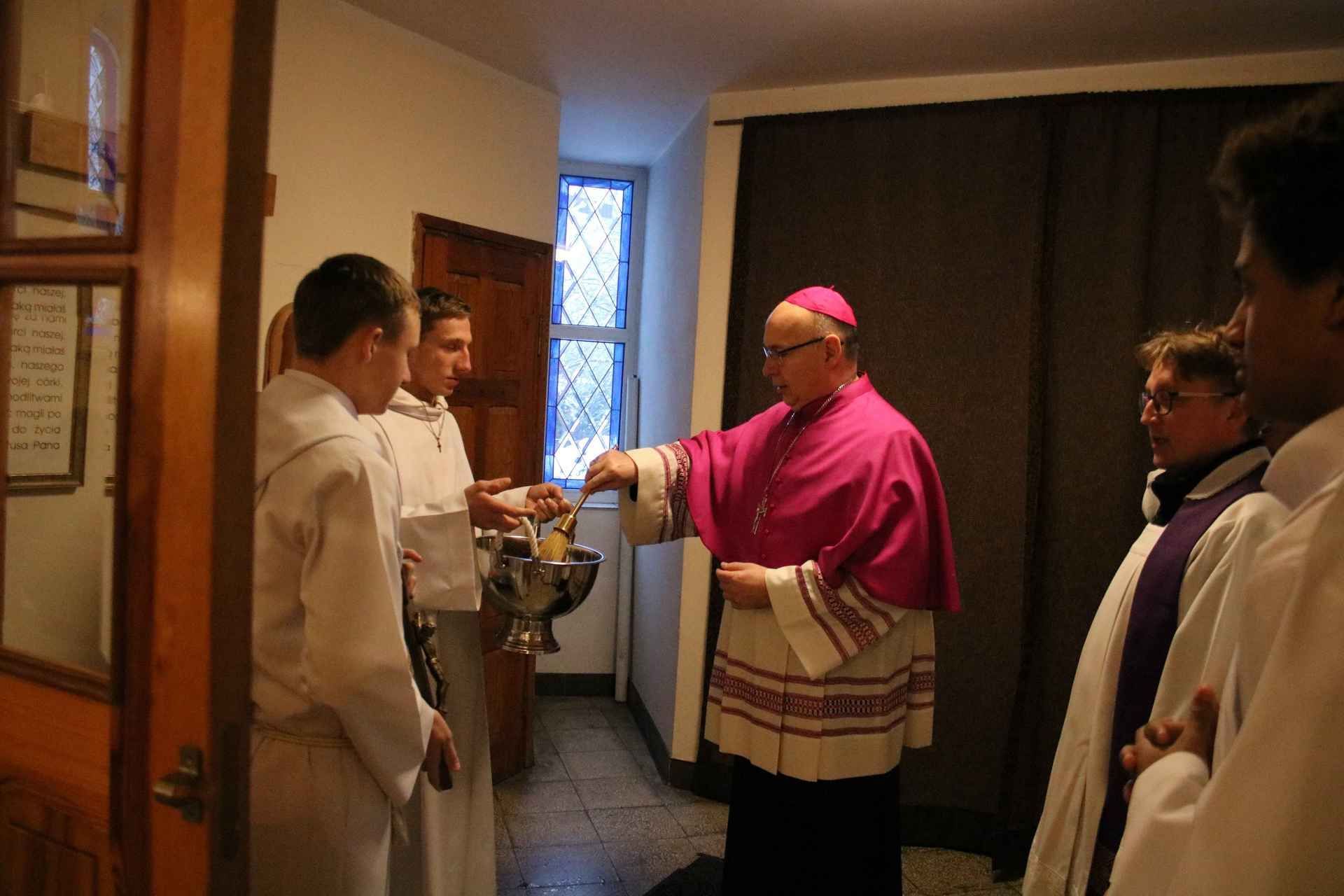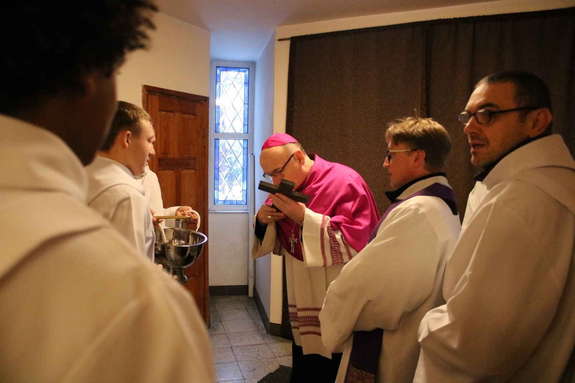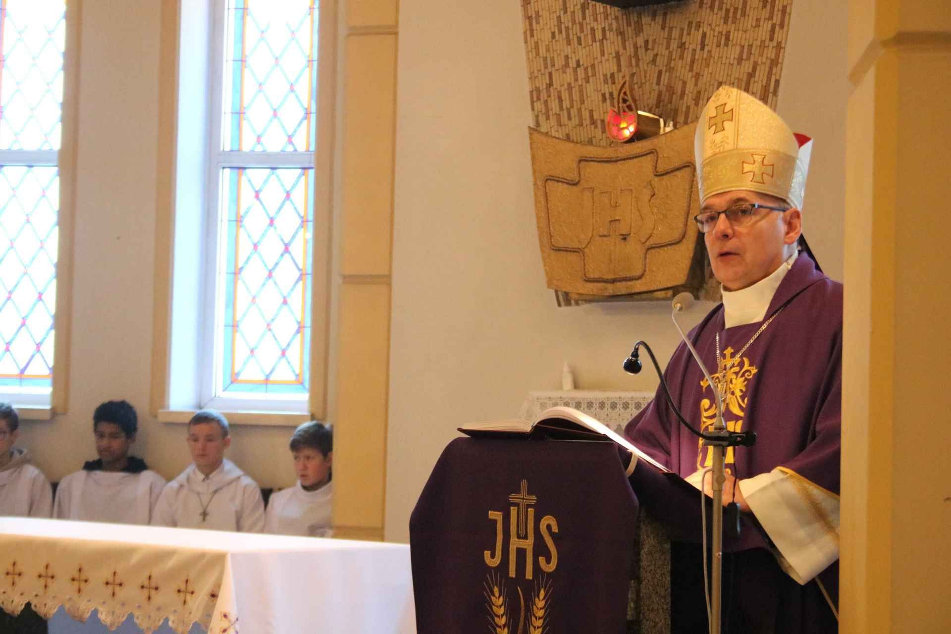 Wizyta ks. Biskupa rozpoczęła się tuż przed godziną ósmą ucałowaniem przez niego krzyża w przedsionku kościoła. Następnie Jego Ekscelencja pokropił wodą święconą wiernych zebranych na porannej mszy świętej. Potem nastąpiła krótka modlitwa, a zaraz po niej oficjalne powitanie dostojnego Gościa przez parafian. Mszę świętą o godz. 8:00 odprawił ks. Mariusz Rybicki – kapelan Biskupa Janusza.